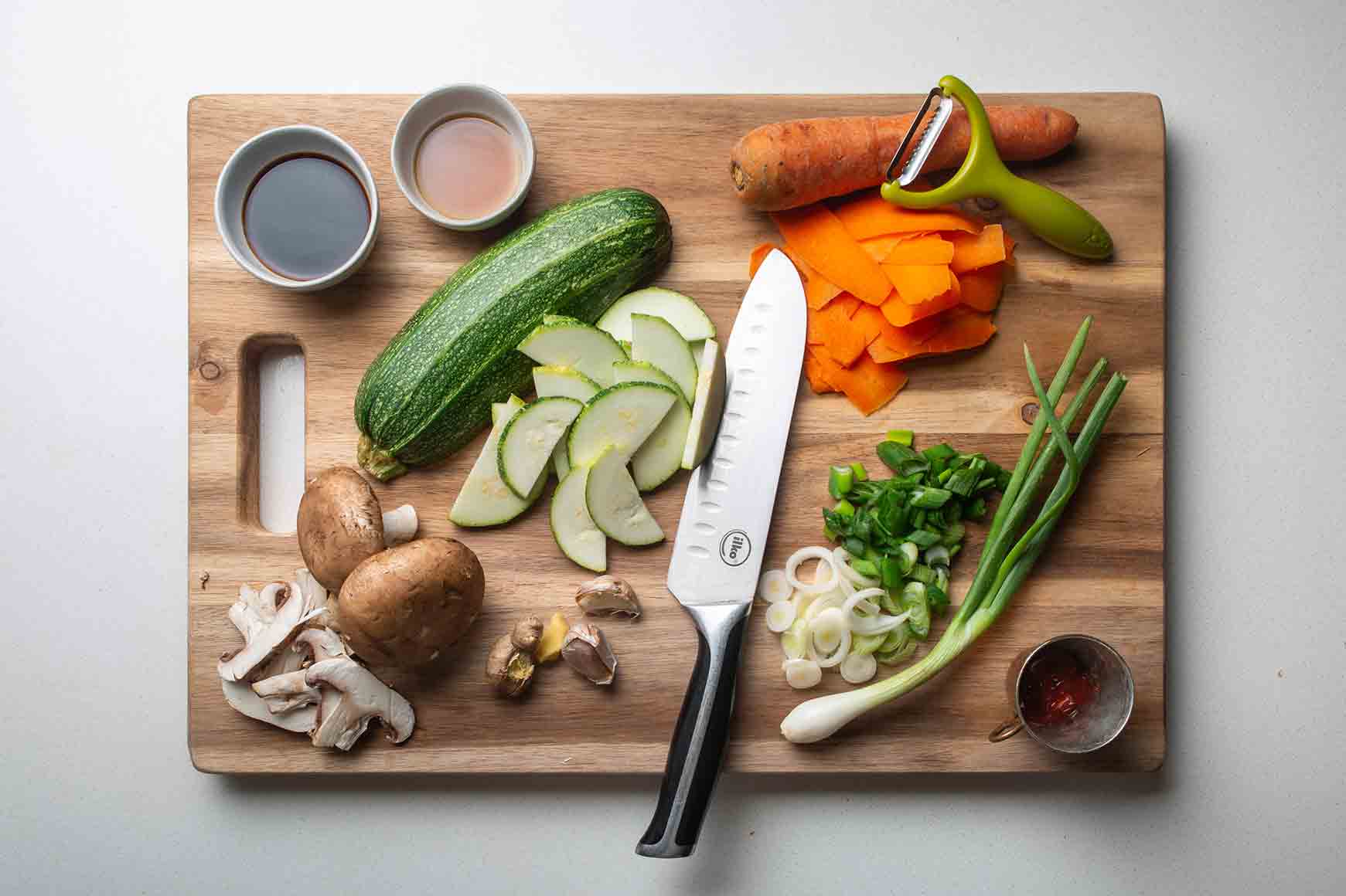 con guarnición de zapallo italiano, champiñones y zanahorias